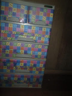 My aunt has this plastic cabinet/containers containing all her undies and it's already old - the white is already dirty white, if you know what I mean. So I got some pretty papers and prepped it. Here's how it looks like before